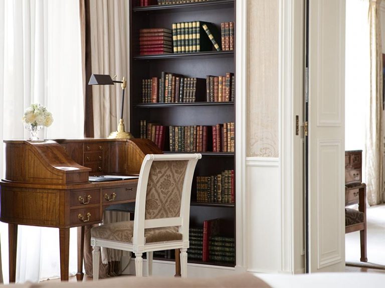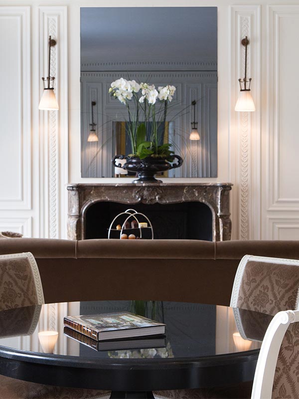 A cozy fireside experience of Paris… Happy moments to be enjoyed serenely here, nestled on the taupe velvet sofa while admiring the marble fireplace, a unique privilege. Directly opposite, the majestic trees of the Avenue Gabriel provide tantalizing glimpses of the glass roof of the Grand Palais, depending on the season. Before the joyfully leaping flames, afternoon tea is more delicious than ever, although the chef’s pastries are a treat for sweet-toothed guests in both summer and winter! Designed like an authentic apartment, the generously sized suite features exceptionally high ceilings. Matt black-lacquered beechwood furniture, some of them gilded, velvet-clad lampshades, rare pieces sourced from the finest Parisian antique dealers, contemporary works of art bearing prestigious names: the decor tells a story in each and every detail. A hidden door leading from the bedroom to the entrance even permits an incognito exit, just like in novels…